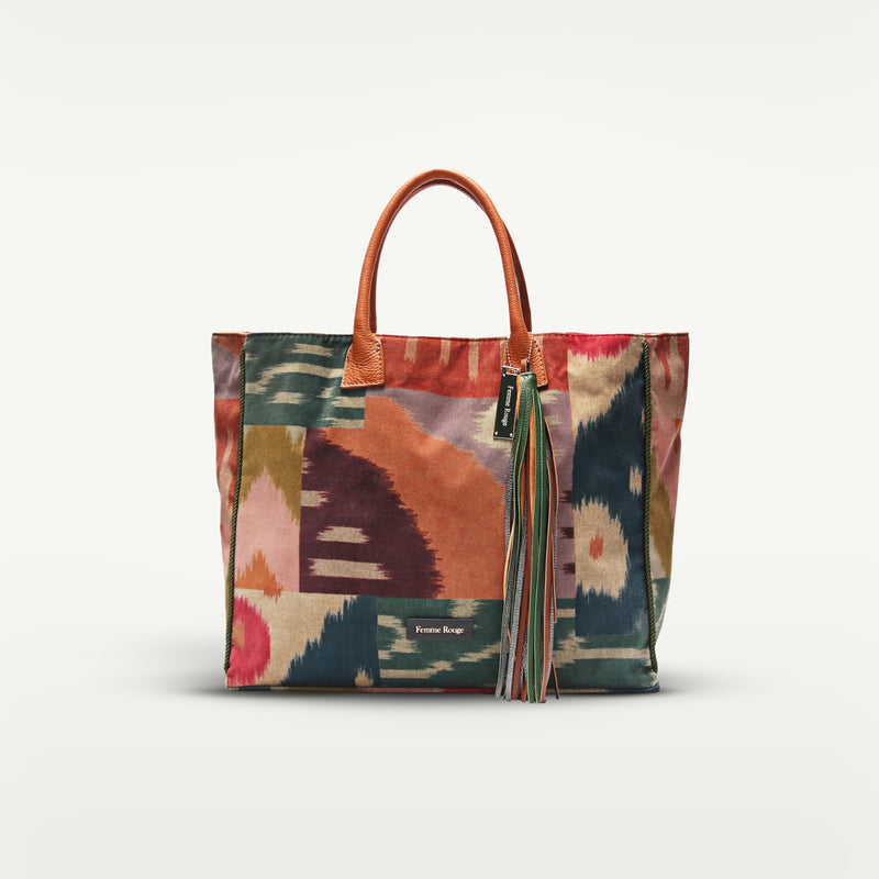 Composizione:Shopping in velluto con manici in pelle di vitello. Bustone interno removibile in velluto con chiusura a cerniera in metallo. Nappa in pelle di vitello removibile. Finiture oro. Progettata e realizzata in Italia.