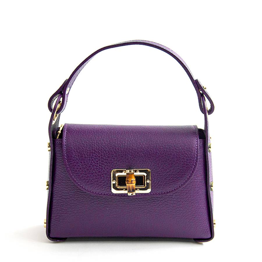 Adatta al tempo libero e perfetta per la sera, borsa di piccole dimensioni in pelle stampa dollaro, con tracolla in pelle e borchie circolari di colore oro. Chiusura a patta e girello decorativo in bambù.