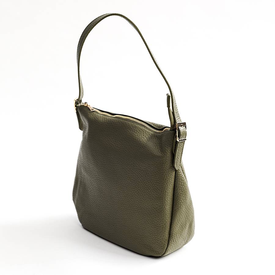 Pratica sacca in morbida pelle dollarone con manico regolabile, chiusura a zip e tasca sul retro. Interno foderato con tasche.