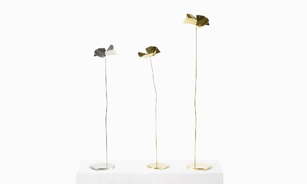 Papavero Delicato si presenta così come unoggetto dall’iconica forma di fiore con petali in acciaio o ottone piegati amano sostenuti da un robusto stelo in inox, fissato ad una base rotondairregolare anch’essa d’acciao inox.