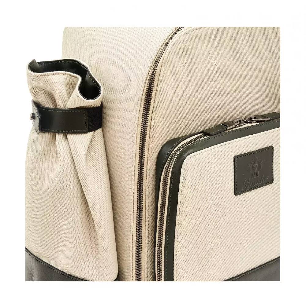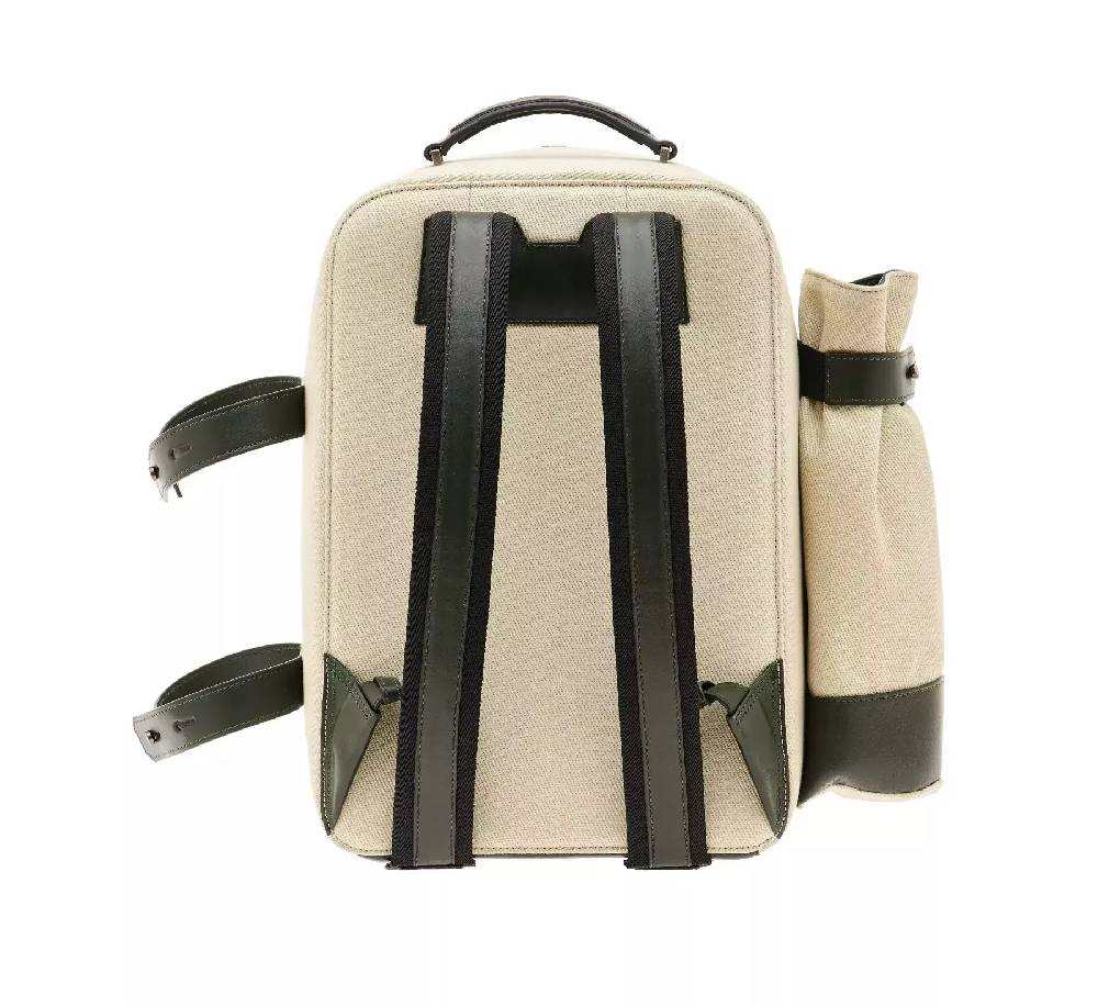 Creata per tutti gli amanti del pic-nic e dellaria aperta, lo zaino da pic-nic Pineider è realizzato in canvas e rifinita con dettagli in vera pelle di vitello. Questo zaino ha unapertura centrale ampia con zip, un manico e degli spallacci foderati e rivestiti in pelle. Gli interni sono divisi con scompartimenti per organizzare al meglio e tenere al sicuro tutto il necessario per un picnic pensato e di grande qualità. Una tasca frontale ampia serve per separare le tovaglie dal set di posate, pia
