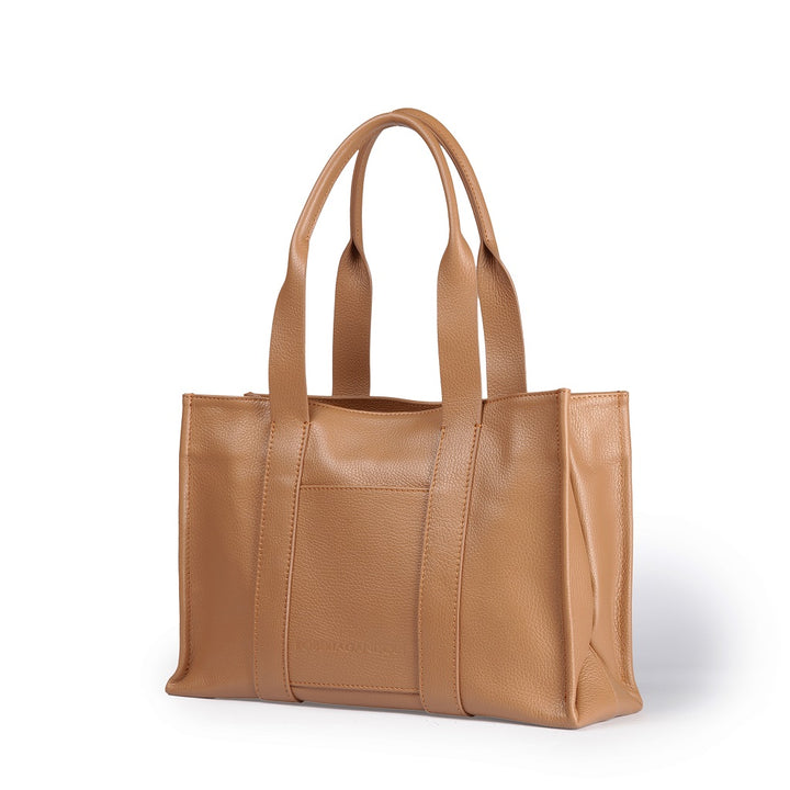 Design minimal con linee pulite e sobrie per uno stile elegante e versatile. Perfetta per l'ufficio e non solo. Realizzata in vitello martellato di alta qualità, leggera e resistente al tempo stesso, adatta per un uso quotidiano. Una comoda tasca esterna per accedere rapidamente agli oggetti di uso frequente. Spaziosa e di dimensioni adatte per contenere documenti formato A4, laptop e tablet. Un tocco di eleganza con charm decorativo portatessera e cuoricino racchiusi in un unico pendente che può essere staccato ed usato come pratico portachiavi. Questa borsa è stata pensata per offrirti praticità e stile in ogni occasione. Scheda Tecnica Materiale : Pelle di vitello martellata Fodera : tessuto Tracolla: --- Chiusura: zip Colore accessori metallici : col. Oro Chiaro Piedini metallo : --- Misure: 38 x 25 x 13 cm (lunghezza x altezza x profondità) 15 x 10 x 5 inch (width – heigh – deep) Lunghezza tracolla: 55 cm - 21 inch Luce manici : 25 cm – 10 inch Altri dettagli : tasca interna chiusa da zip e altra doppia tasca per riporre gli oggetti più piccoli Peso : 0,715 kg - 1,57 lb Cura : Pulire con panno morbido e crema neutra