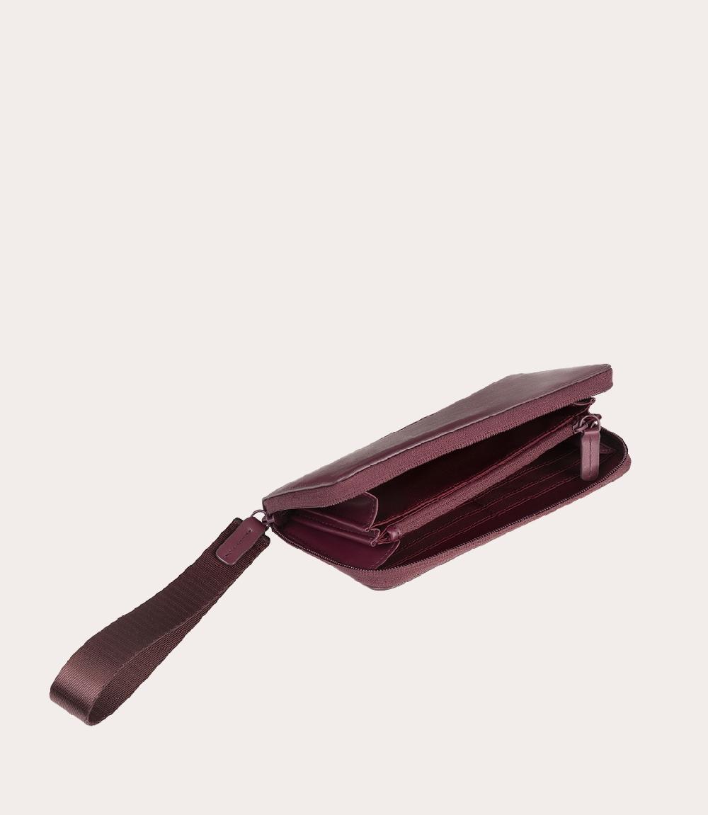 Portafogli orizzontale grande con vano centrale chiuso da tirazip e comodo nastro da polso. Realizzato in pelle sintetica ottenuta dalla plastica riciclata, il portafogli Palma ha un'ottima organizzazione degli spazi ed è dotato di protezione RFID.