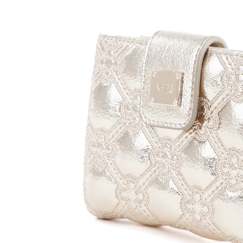 Portafoglio in metallizzato matelassè logata con placchetta logata.