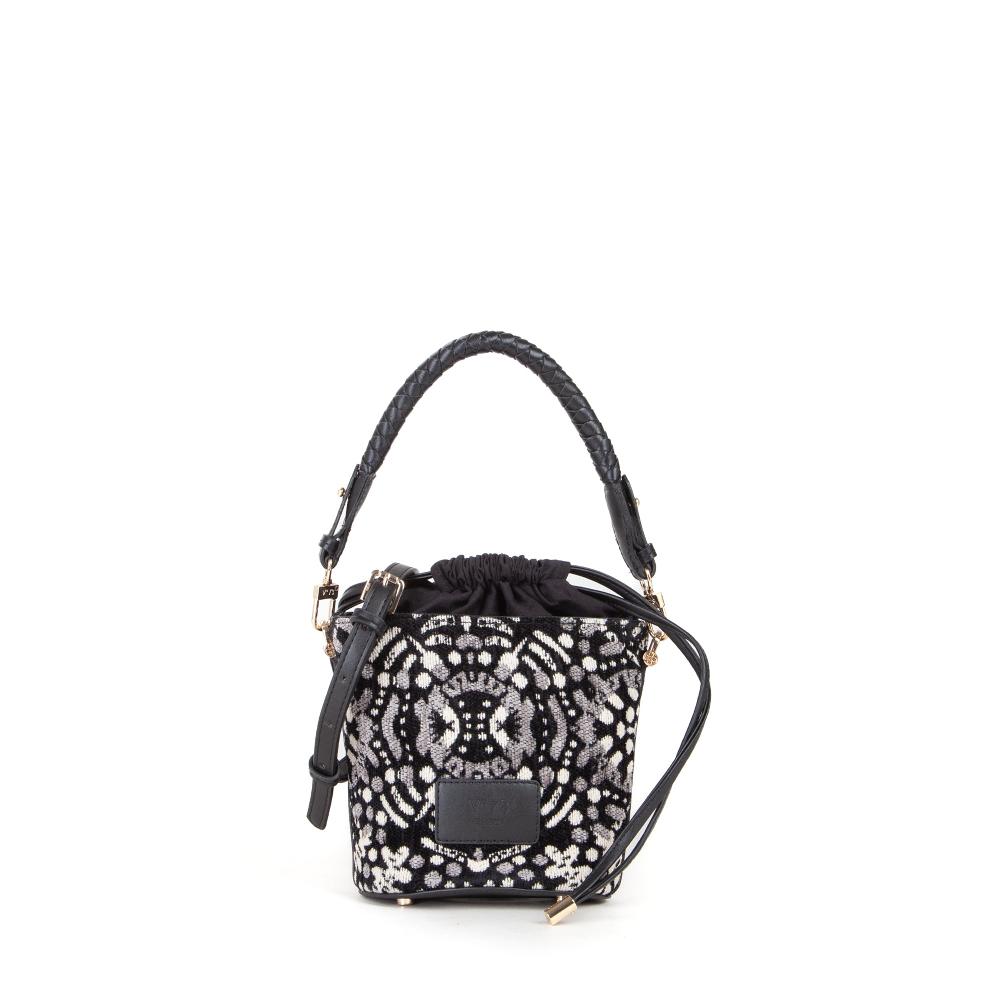 Secchiello in tessuto fantasia con manici intrecciati e riporti in micro grana. Patch con logo embossed e chiusura con coulisse. Inaggiunta una seconda tracolla per una doppia portabilità.